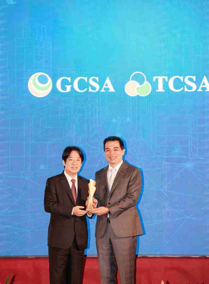 达全方位永续表现获全球永续奖及台湾永续奖肯定,,,,由副总统赖清德颁奖 (左),,彩运网总经理柯富仁 (右) 代表领奖