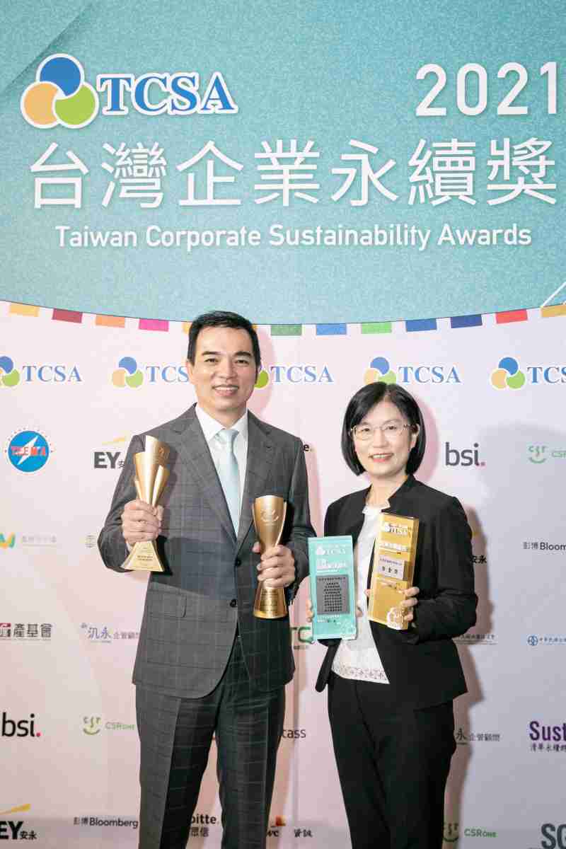 达在台湾永续奖所评比环境、、、社会、、治理等各面向的永续绩效均获高度肯定 (左:彩运网光电总经理暨营运长柯富仁,,,,右:彩运网光电永续长古秀华)