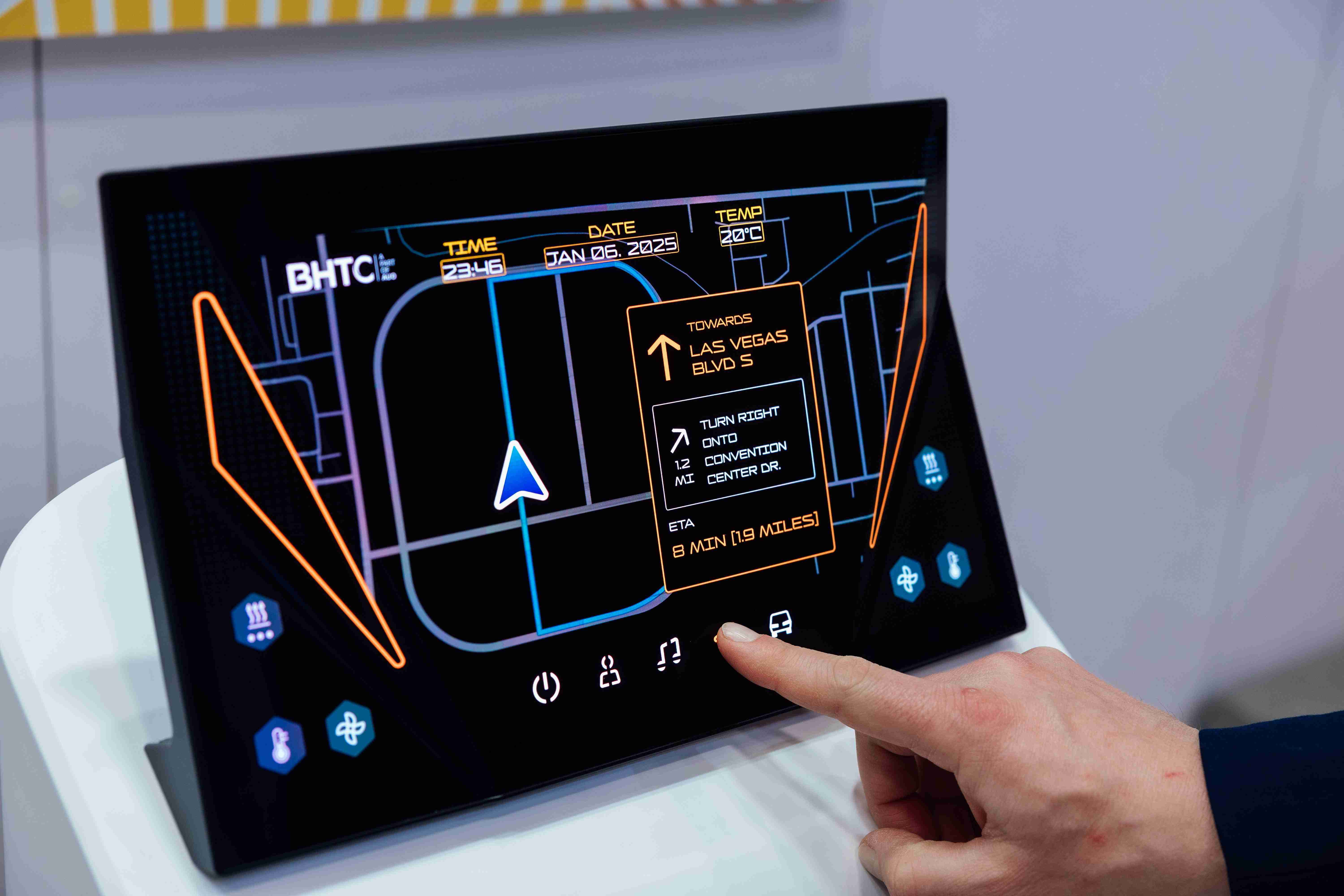 Micro LED可折迭触控显示器(Haptifold Display)结合BHTC多年HMI设计经验,,,,整合中控台和温度控制功能,,以优美的曲面和独特的外型助力车内设计美学,,,,在辅以触控回馈下,,为驾驶带来更直觉的使用体验。。