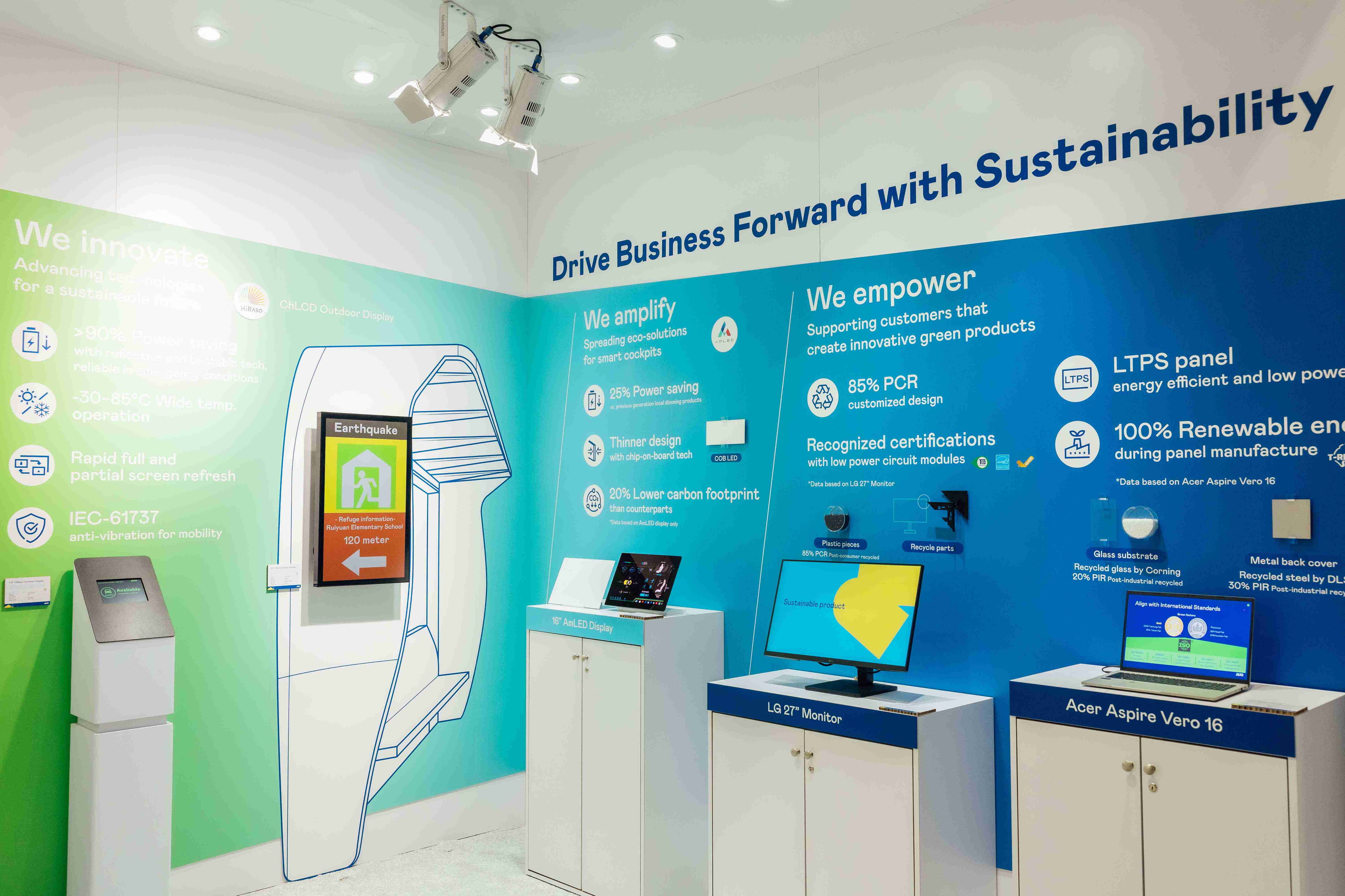 彩运网运用创新显示技术HiRaso胆固醇液晶双稳态技术达到显示零耗能、、、、扩大节能省电的AmLED显示技术应用于车用产品、、、、以再生的消费后回收(PCR)塑料及全绿电生产之面板,,,应用于笔电及萤幕,,增加绿色价值。。。。