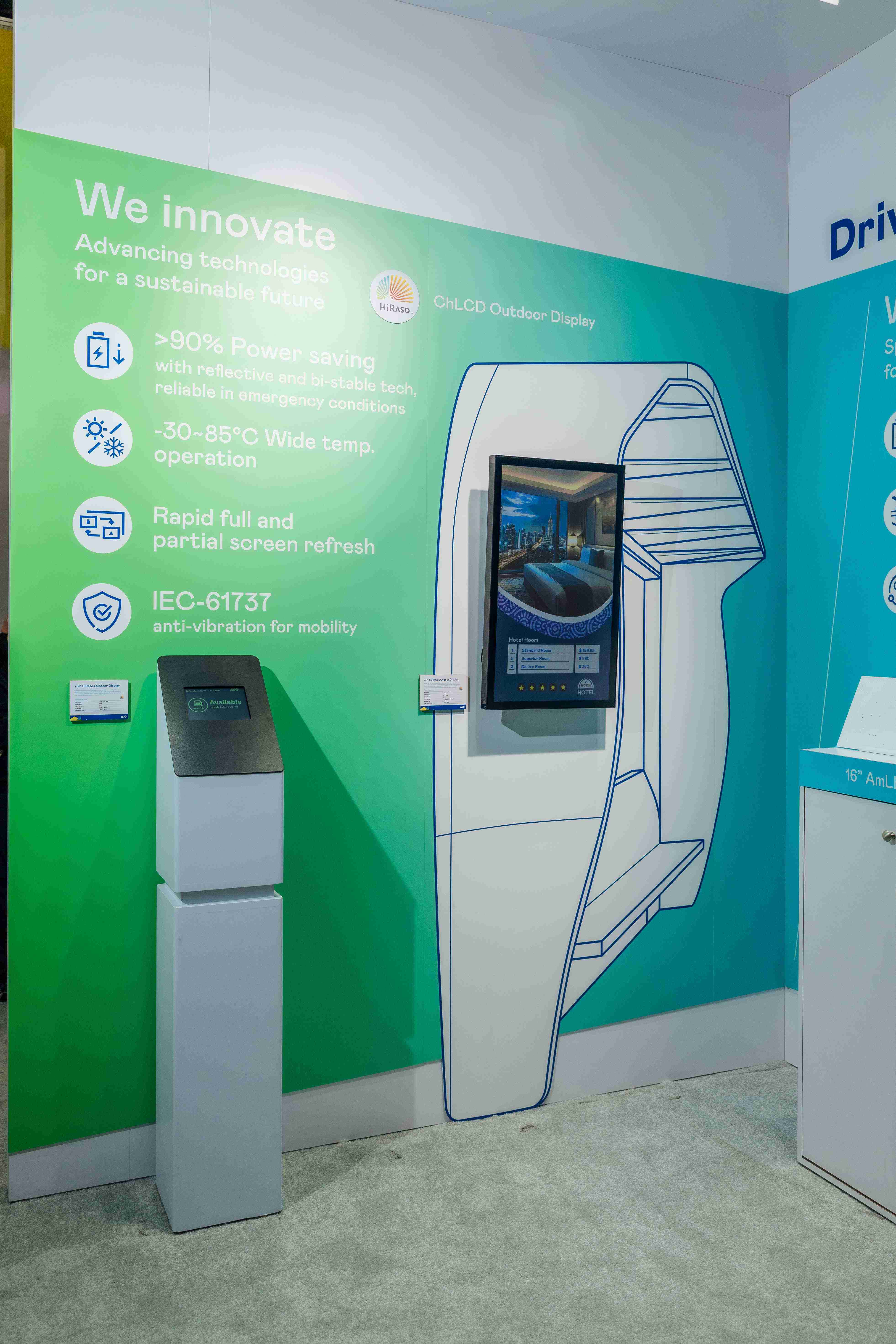HiRaso胆固醇液晶显示器运用反射环境光线的方式,,,,呈现影像显示时零耗能的环保省电诉求,,,,光线愈强愈能呈现绝佳的色彩饱和度及显示效果,,,同时在摄氏-30度至85度间宽温的使用优势,,,为户外电子看板的新首选。。。