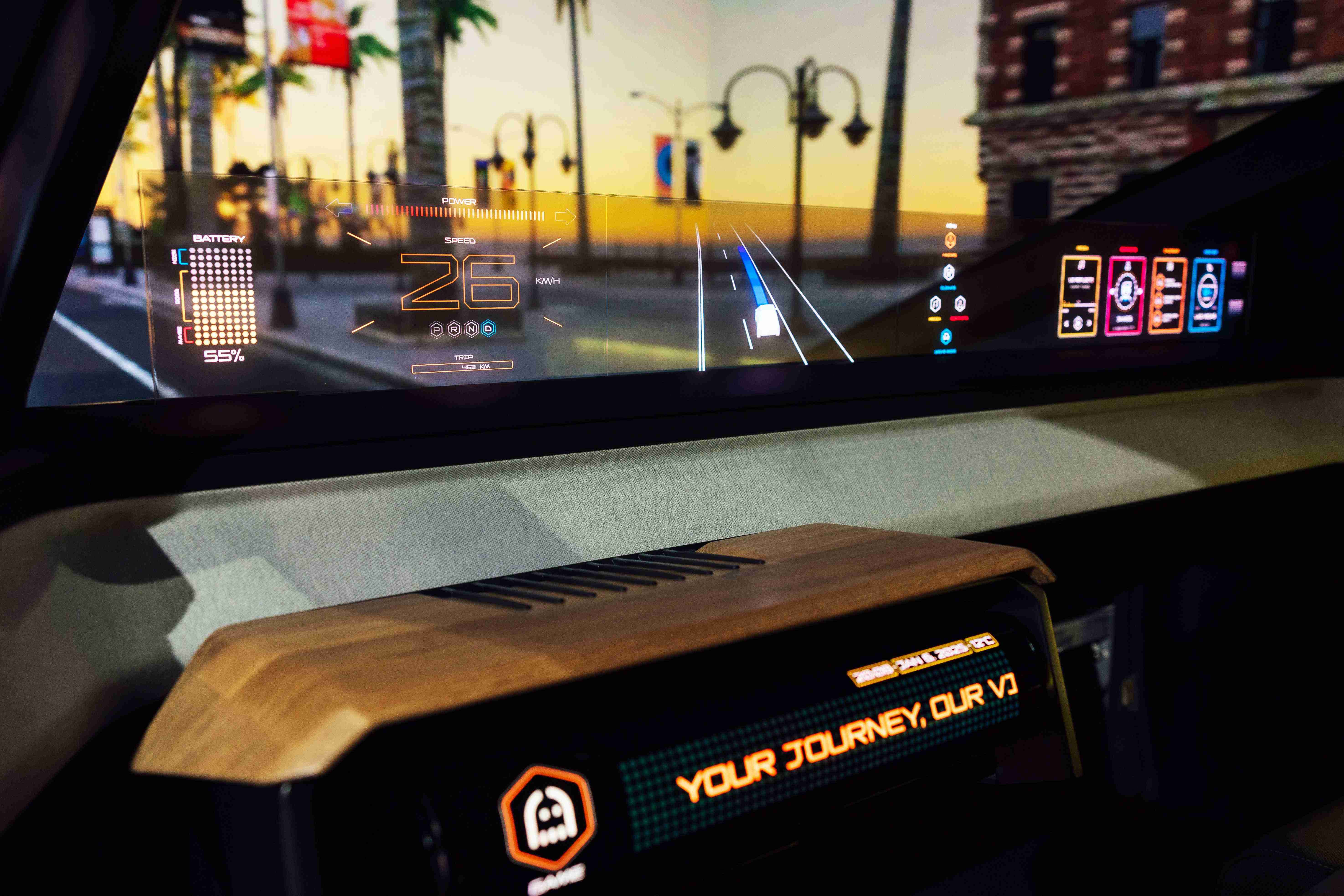 车用运算方案驱动无界透明显示介面(Horizon Image Glass),,整合仪表板、、、、中控及副驾显示功能为一体式全景呈现,,不仅提供清晰的外部视野,,,亦能即时显示车辆状态、、、导航及路况资讯,,,并赋予个性化设定与驾驶安全警示等加值化服务。。